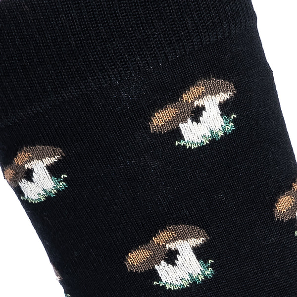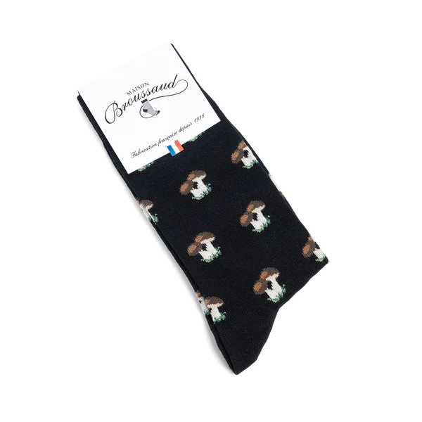 Les amoureux de l’automne et amateurs de la cueillette de champignons vont adorer cette paire de chaussettes en laine de la Maison Broussaud. Inspirée de la forêt, ce modèle de chaussette est décoré de motifs de cèpes (Boletus edulis) sur fond noir.