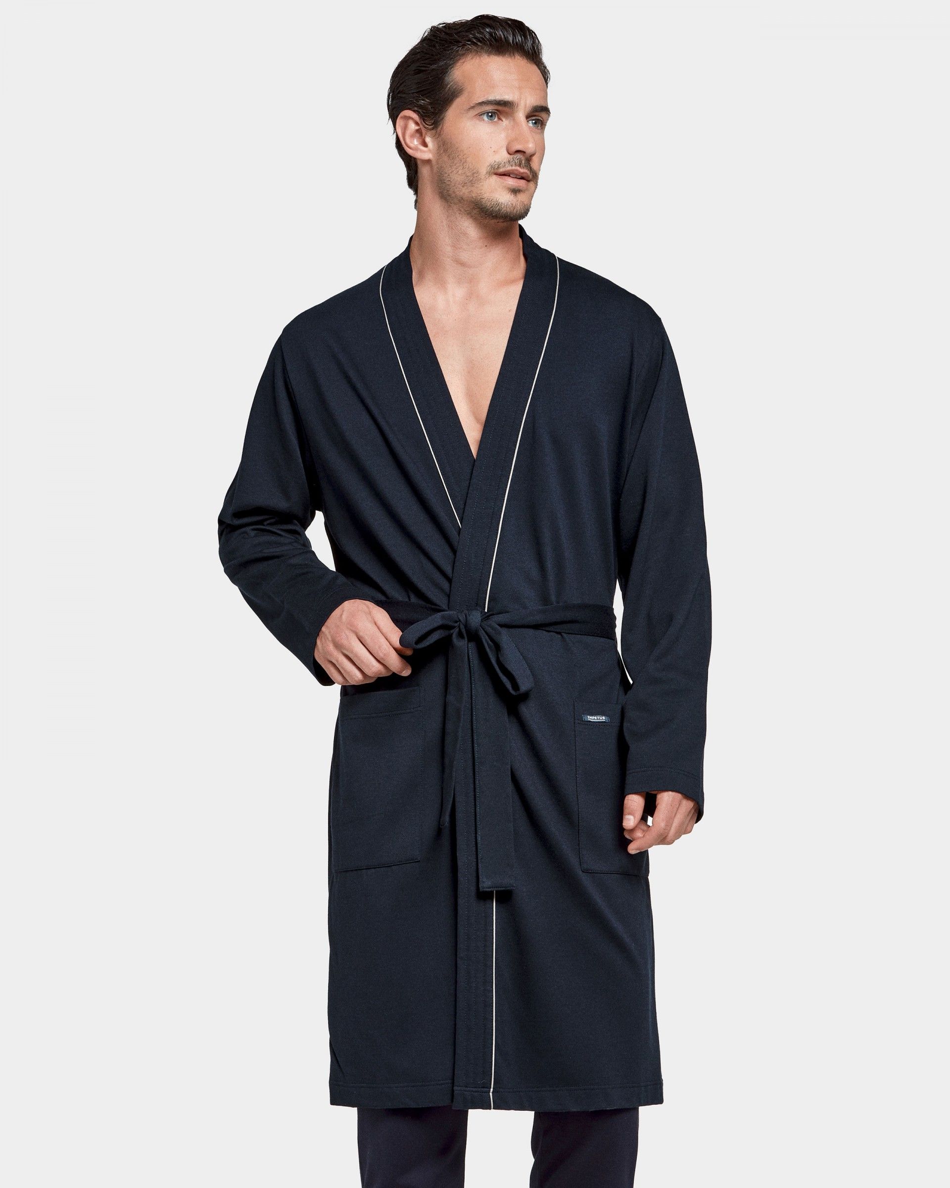 Ce peignoir kimono marine fabriqué à partir du Lyocell (extrait de l’eucalyptus) offre un grand confort.